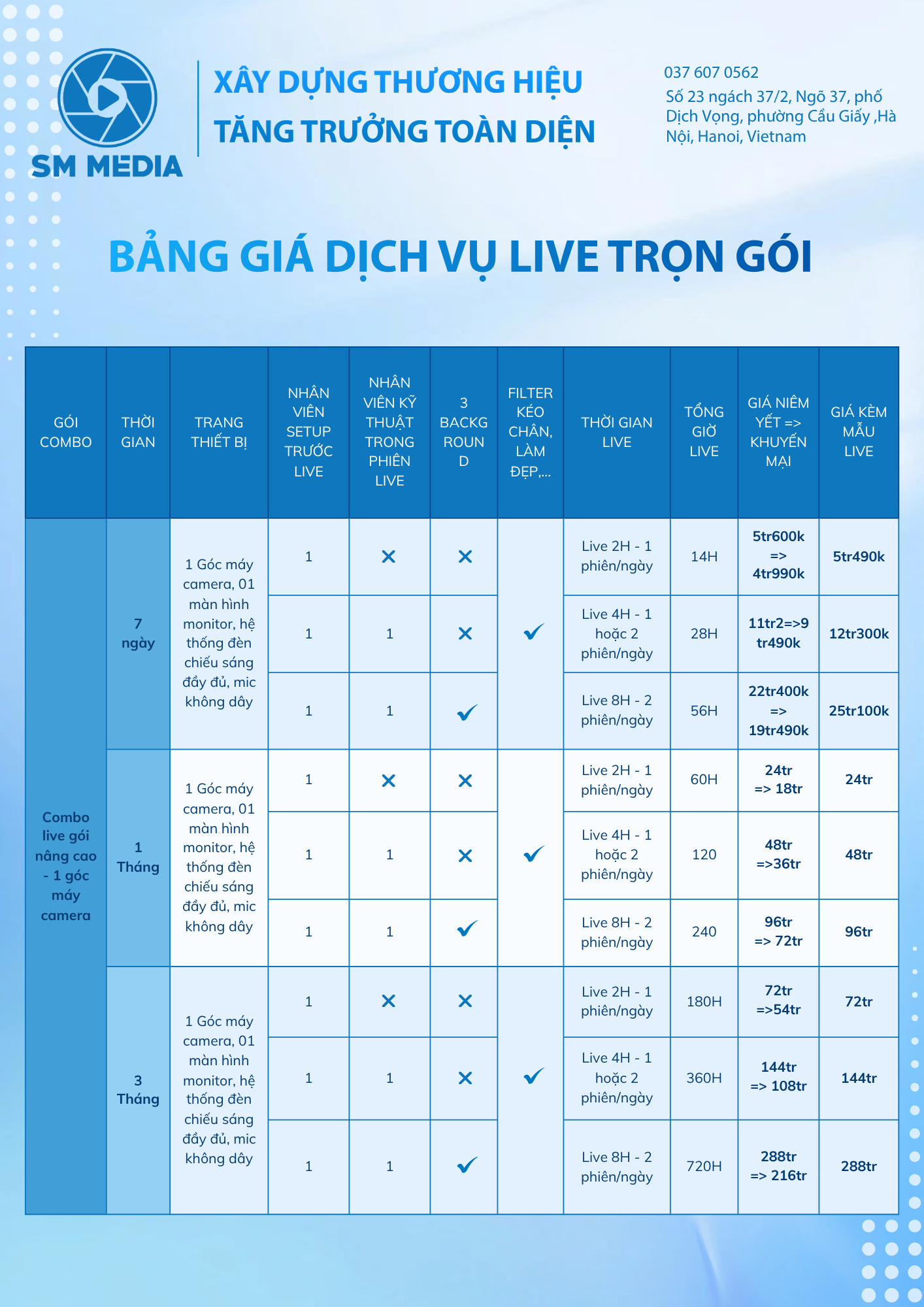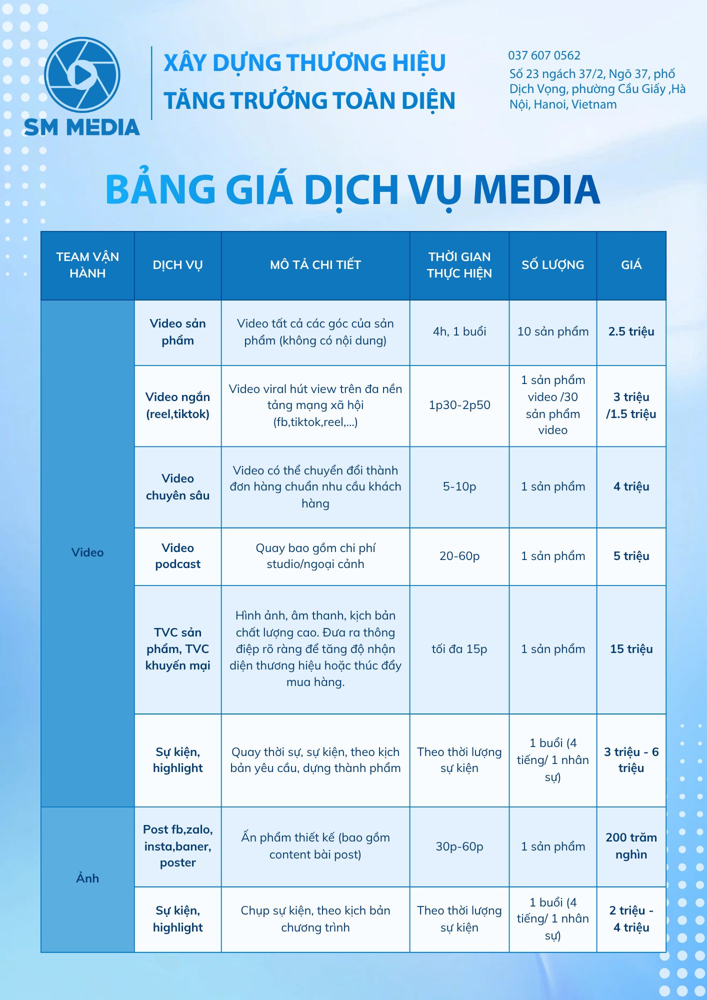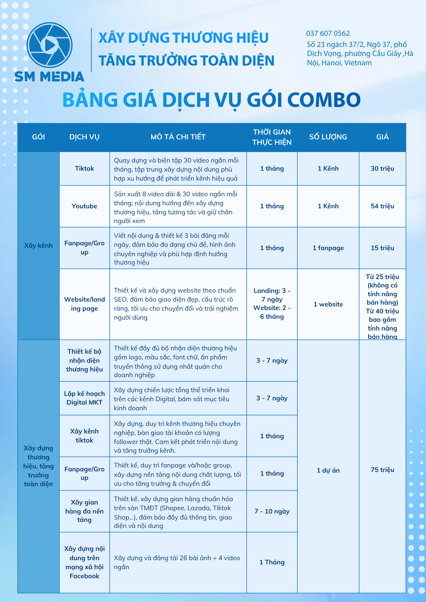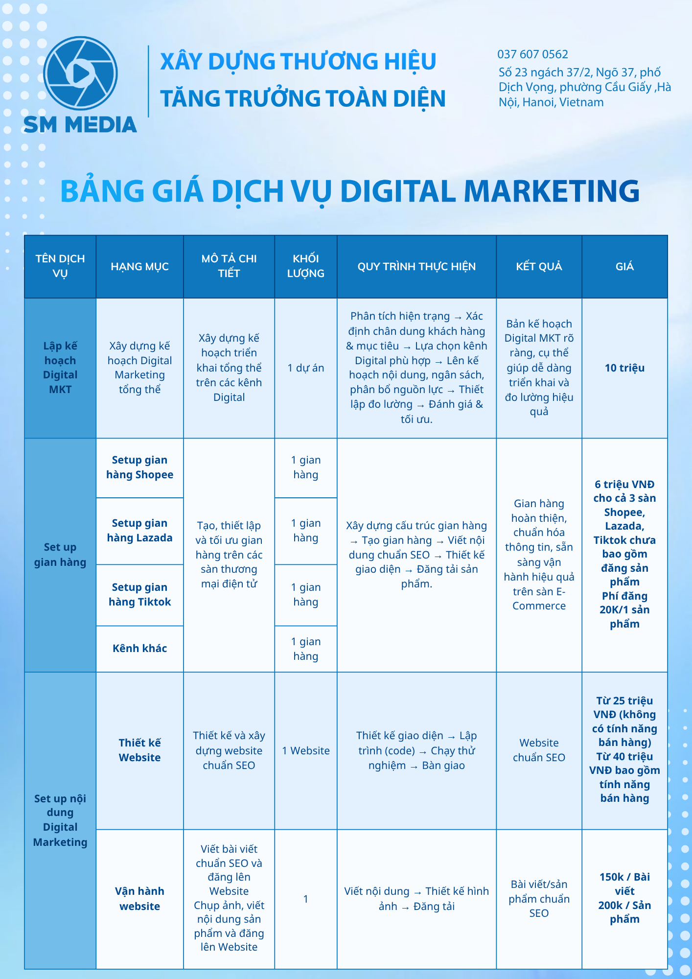 Là agency truyền thông tích hợp, SM Media cung cấp hệ sinh thái dịch vụ từ Digital Marketing, Media Production, Livestream – Studio Setup đến E-Commerce. Doanh nghiệp chỉ cần một đối tác duy nhất để triển khai trọn vẹn chiến lược, đảm bảo tính nhất quán về thông điệp, hình ảnh và trải nghiệm thương hiệu.