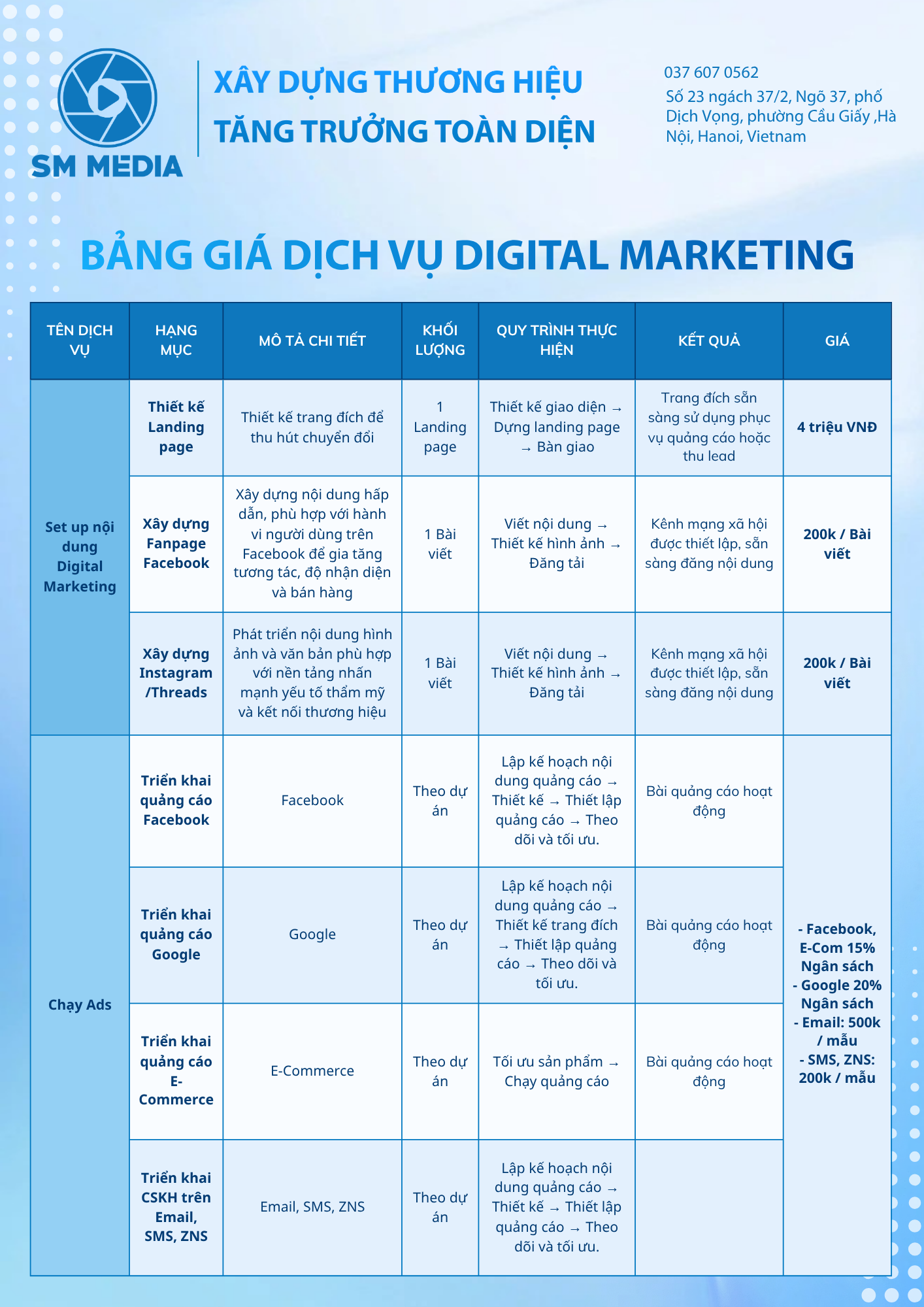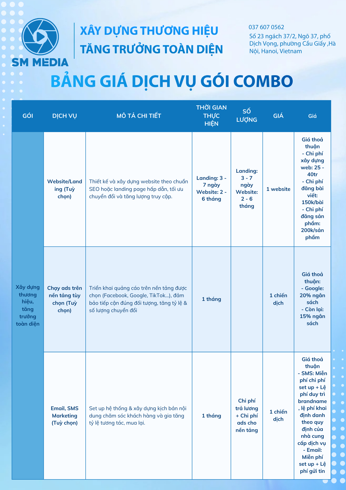 SM Media không chỉ cung cấp dịch vụ, mà trở thành đối tác phát triển cùng doanh nghiệp. Chúng tôi cam kết về kết quả: hiệu suất chiến dịch, nhận diện thương hiệu, và giá trị kinh doanh thực tế – với tinh thần hợp tác bền vững và trách nhiệm trong từng dự án.